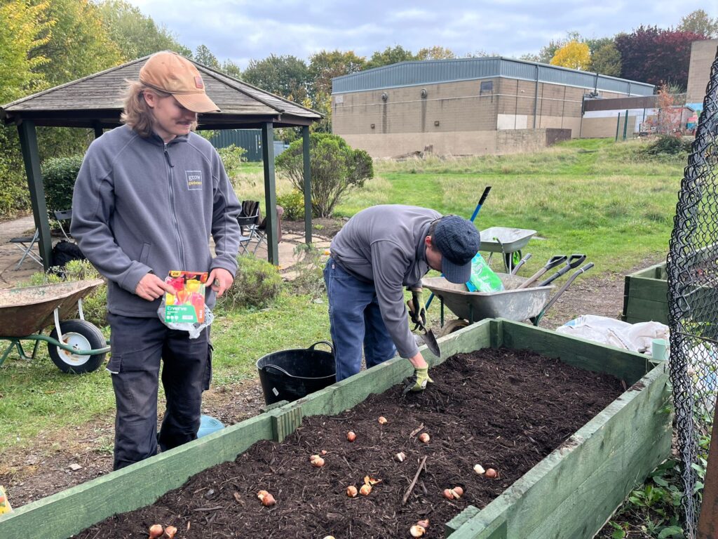 Green space transformation: Our trainees completely transformed an on-site green space for the High Green community to enjoy. The area was previously abandoned and overgrown, providing the perfect canvas for the trainees to get stuck in. They tackled everything from clearing an old pergoda structure to mowing, planting, and even building new raised beds through woodworking.